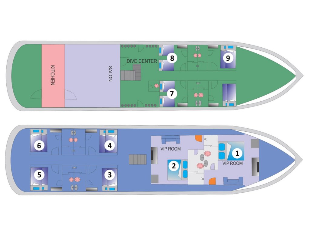 - všechny kajuty pro 2 osoby (v některých palandových kajutách mohou být 3)